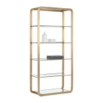 This modern bookcase will bring elegance and sophistication to home office. living. lounge spaces and more. Features four clear glass shelves and a mirrored bottom shelf for ample storage. The design also features a round edge frame in brushed gold stainless steel. Made in India: With refined craftsmanship. this design was brought to life by skilled local artisans. By nature. these materials develop unique imperfections such as fissures. markings and colour variations for a truly one-of-a-kind piece.